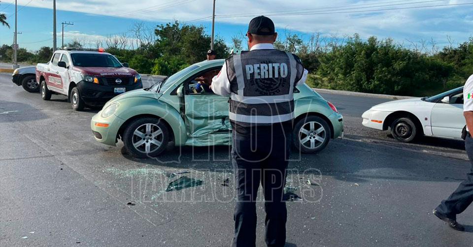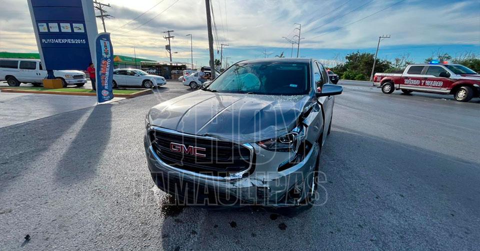Matamoros, Tamaulipas. - Una jovencita que viajaba con su hijo causó un fuerte choque al atravesarse a la avenida Lauro Villar, resultando levemente lesionada, al igual que su hijo que la acompañaba.