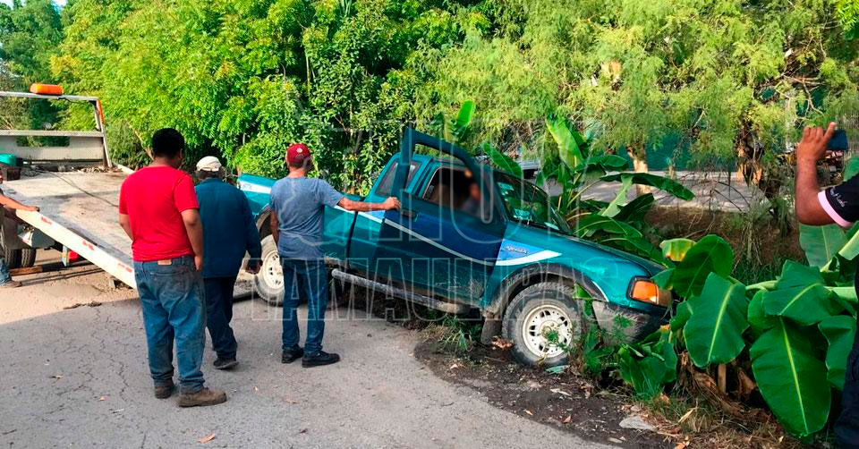 El Mante, Tamaulipas. –El conductor de una camioneta y su esposa se llevaron un buen susto luego de estar a punto de precipitarse a un canal de agua, todo por querer limpiar el caldo de bagre que se derramó en la unidad.