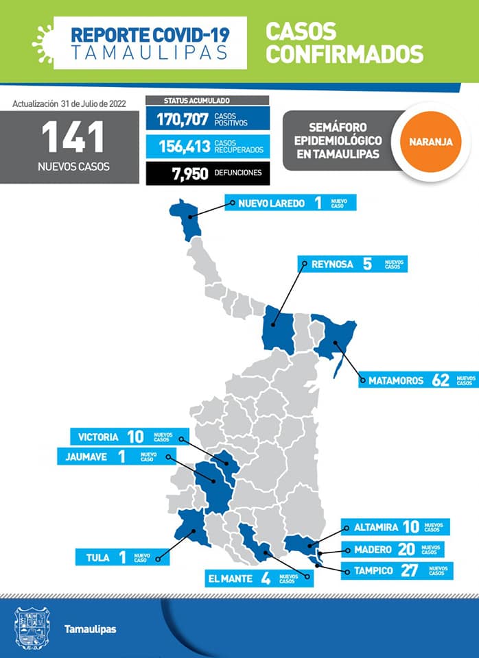 Cierra este domingo Tamaulipas con 141 nuevos contagios de Covid-19