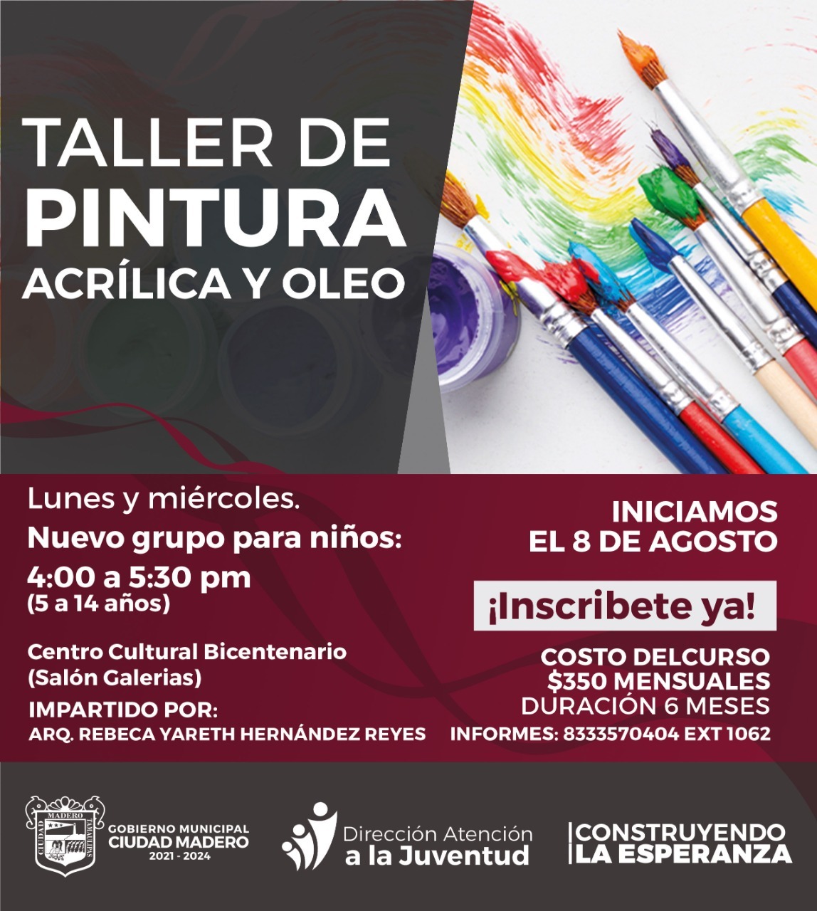 Ciudad Madero, Tamaulipas. - Para seguir fomentando el arte a través de sus distintas expresiones, el Gobierno que preside el alcalde Adrián Oseguera Kernion, invita a niños y jóvenes a inscribirse al Taller de Pintura Acrílica que se llevará a cabo en el Centro Cultural Bicentenario, el próximo 8 de agosto.