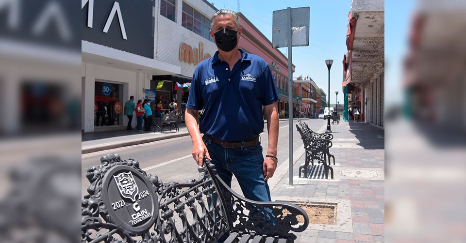 El presidente Municipal Chucho Nader comentó que los trabajos consisten en la instalación de nuevas bancas metálicas con el escudo de Tampico que permite a compradores y turistas descansar o disfrutar el centro de la ciudad.