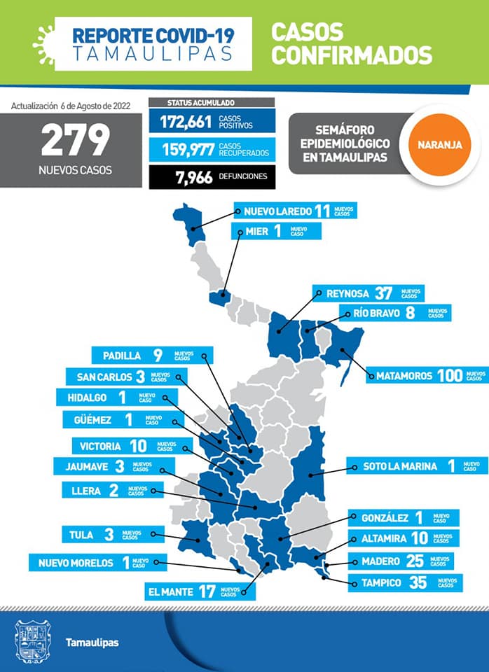 Ciudad Victoria, Tamaulipas. – Un total de 279 nuevos contagios de Covid-19 sin ninguna muerte por complicaciones graves de la enfermedad se registraron este sábado en Tamaulipas, confirmó la Secretaría de Salud del Estado.