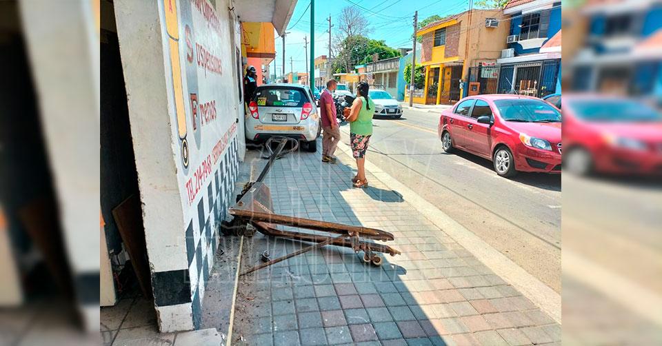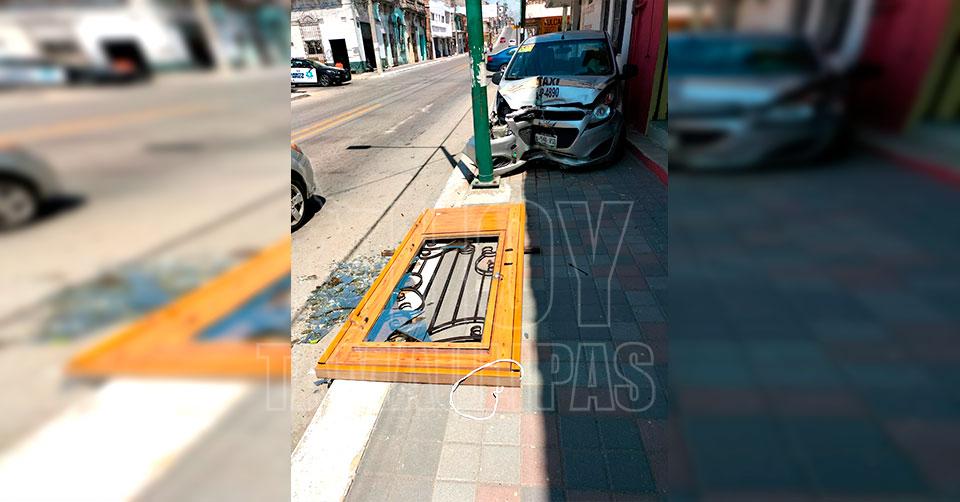 Tampico, Tamaulipas. - Aparatoso accidente vial protagonizó un taxista, a quien presuntamente se le bajó el azúcar y al perder el control de su unidad trepó a la banqueta, donde se estrelló contra un poste, la puerta de exhibición de una herrería y causó daños a dos locales, resultando el conductor con algunas lesiones menores.