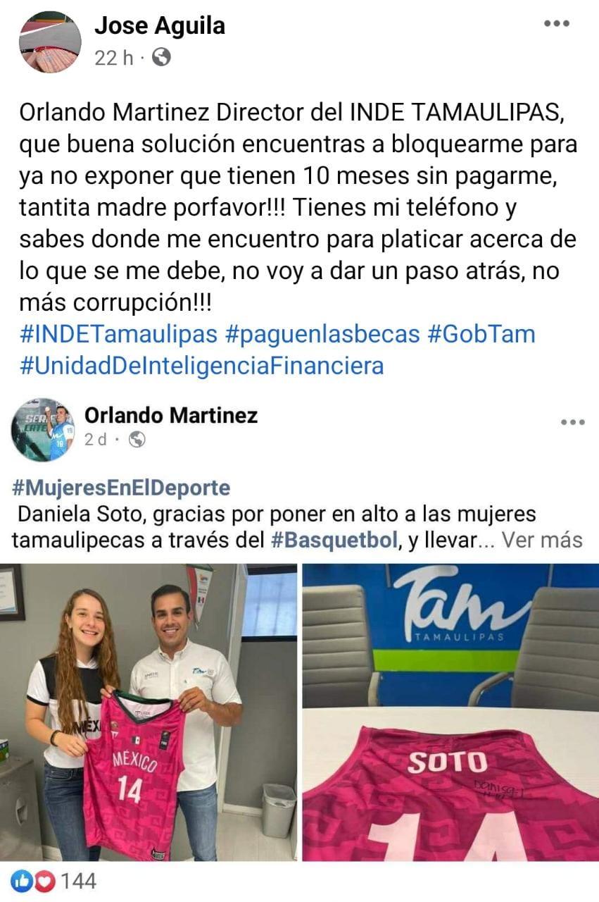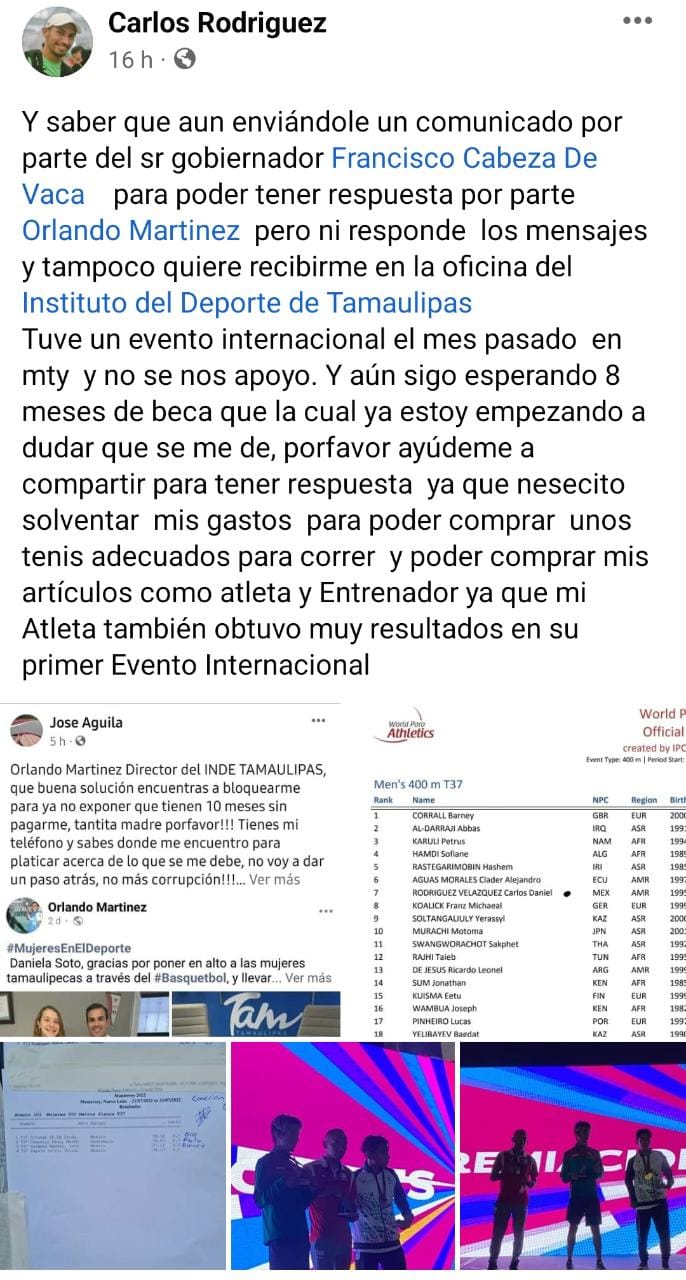 "Y saber que aun enviándole un comunicado por parte del señor gobernador Francisco Cabeza de Vaca para poder tener respuesta por parte Orlando Martínez; pero ni responde los mensajes y tampoco quiere recibirme en la oficina del Instituto del Deporte de Tamaulipas", señaló.