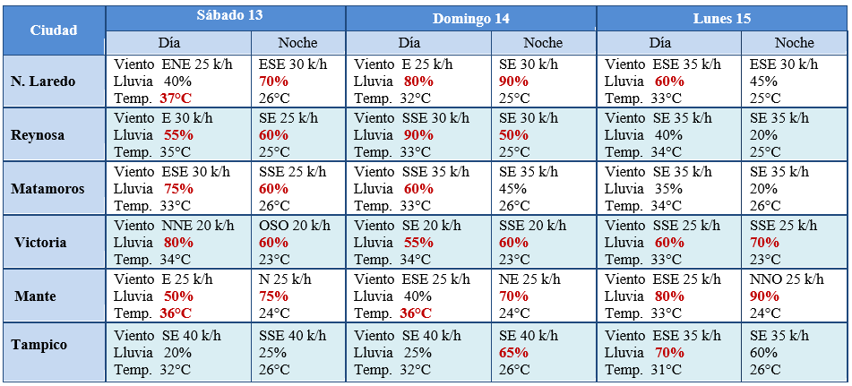 Zona Centro: Se prevé a partir del sábado temperatura máxima de 34°C y mínimas de 23°C, con viento moderado de dirección este sureste de 20-25 km/h con rachas que podrían superar los 50 km/h principalmente en zonas costeras. Mínima de 13°C durante la noche en Miquihuana. Alta probabilidad de lluvia de ligera a moderada puntual durante el periodo de pronóstico.