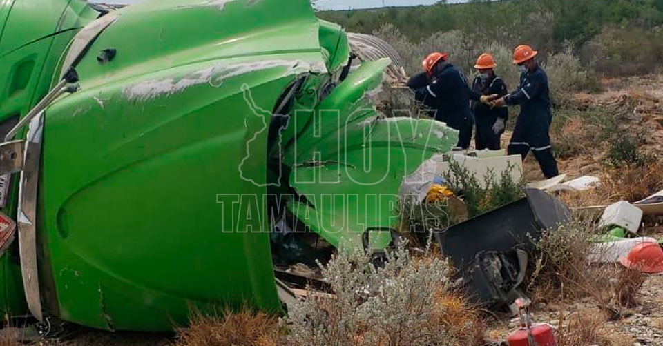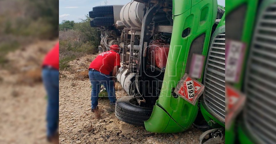 Vuelca pipa cargada con líquido inflamable en Miguel Alemán