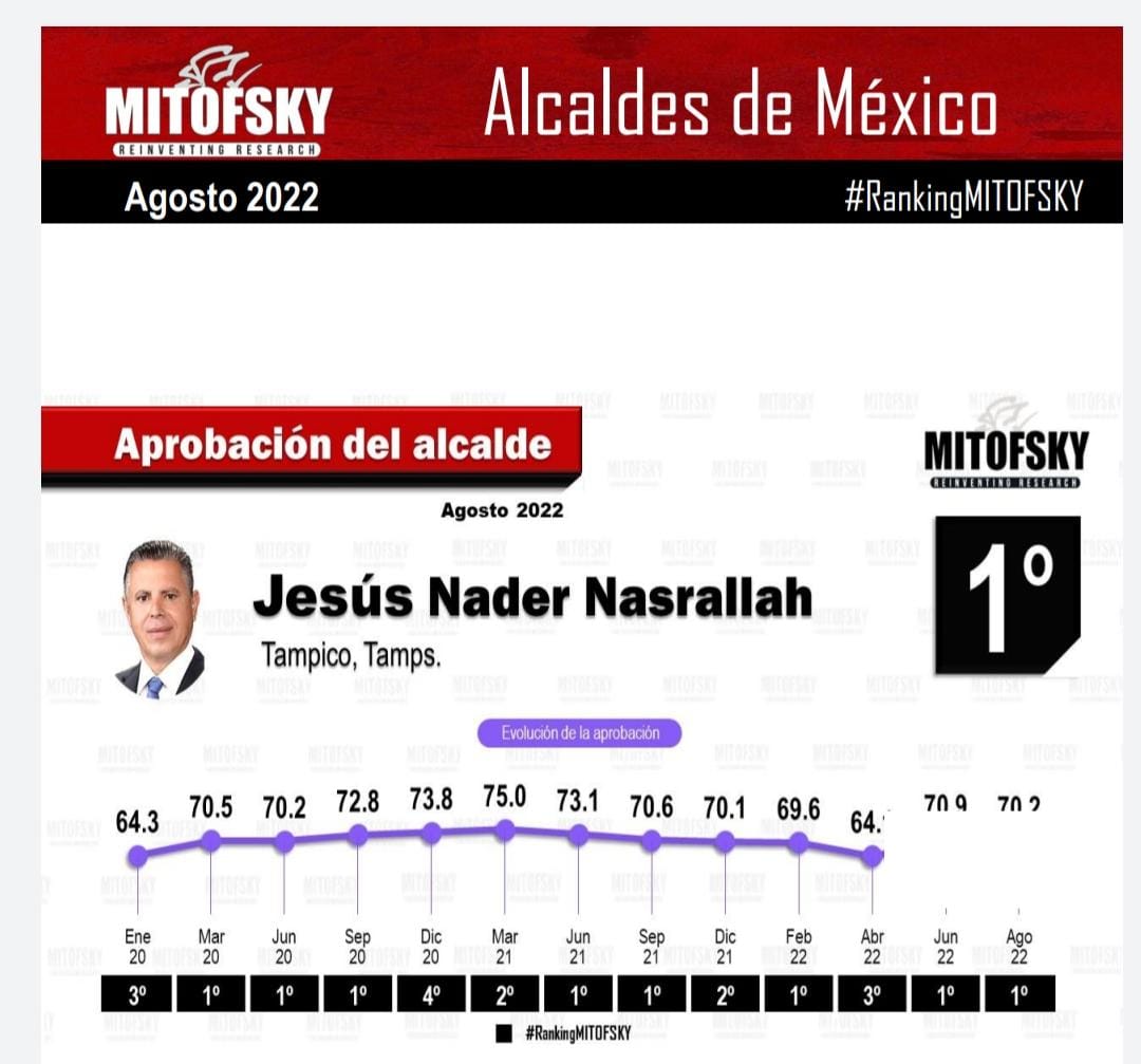 Tampico, Tamaulipas.- Con una aprobación del 70.2 por ciento, el Presidente Municipal Chucho Nader se sitúa por tercer mes consecutivo como el Alcalde mejor evaluado del país, de acuerdo con la reciente encuesta nacional elaborada por la empresa Consulta Mitofsky que abarca las 150 ciudades más importantes de la República.