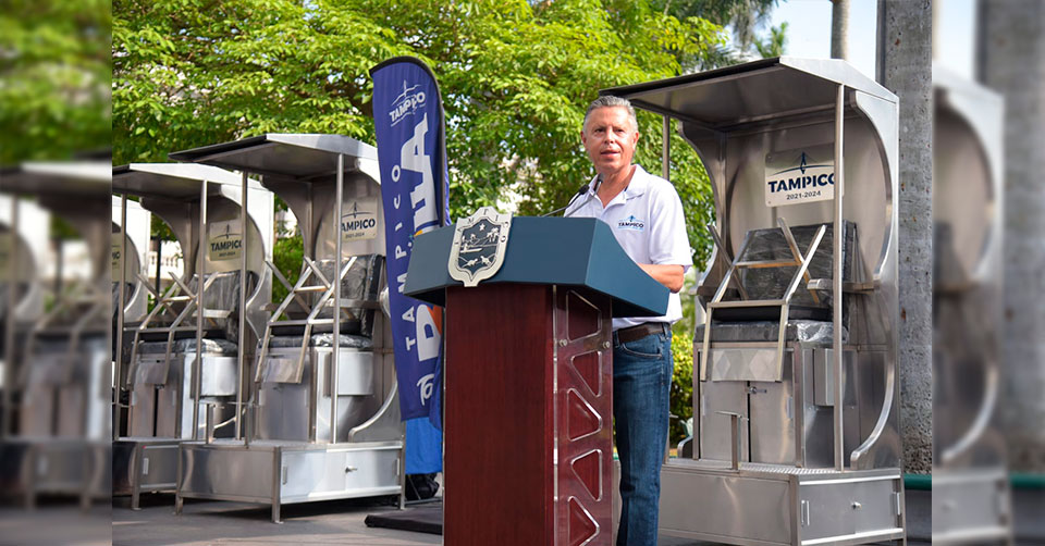 Tampico, Tamaulipas. - Al reconocer la importante contribución histórica y turística de los boleros en el desarrollo de Tampico desde hace un siglo, el presidente municipal Chucho Nader encabezó, este lunes, la entrega de 37 modernos módulos para el aseo de calzado que serán instalados en las plazas de Armas y Libertad.