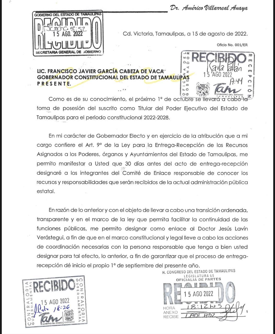 “En mi carácter de Gobernador Electo y en ejercicio de la atribución que a mi cargo confiere el artículo 9 de la Ley para la entrega-recepción de los recursos asignados a los Poderes, Órganos y Ayuntamientos del Estado de Tamaulipas, me permito manifestar a Usted que 30 días antes del acto designaré a los integrantes del Comité de Enlace responsable de conocer los recursos y responsabilidades que serán recibidos de la actual administración pública estatal”, indica el oficio que fue recibido esta tarde en la Oficina del Gobernador Francisco García Cabeza de Vaca.