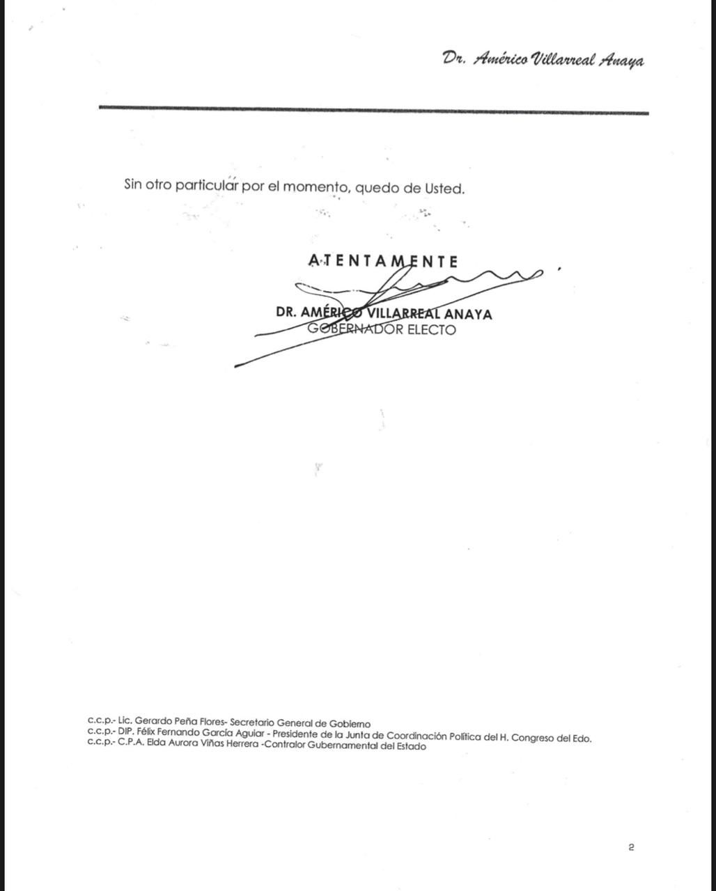 En el mencionado documento, el doctor Américo Villarreal agrega que su objetivo es llevar a cabo una transición ordenada, transparente y en el marco de la Ley que permita facilitar la continuidad de las funciones públicas.