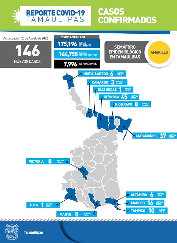 Ciudad Victoria, Tamaulipas. - Un total de 146 nuevos contagios de Covid-19 sin ninguna muerte por complicaciones graves de la enfermedad se reportaron hoy en Tamaulipas, informó la Secretaría de Salud del Estado.