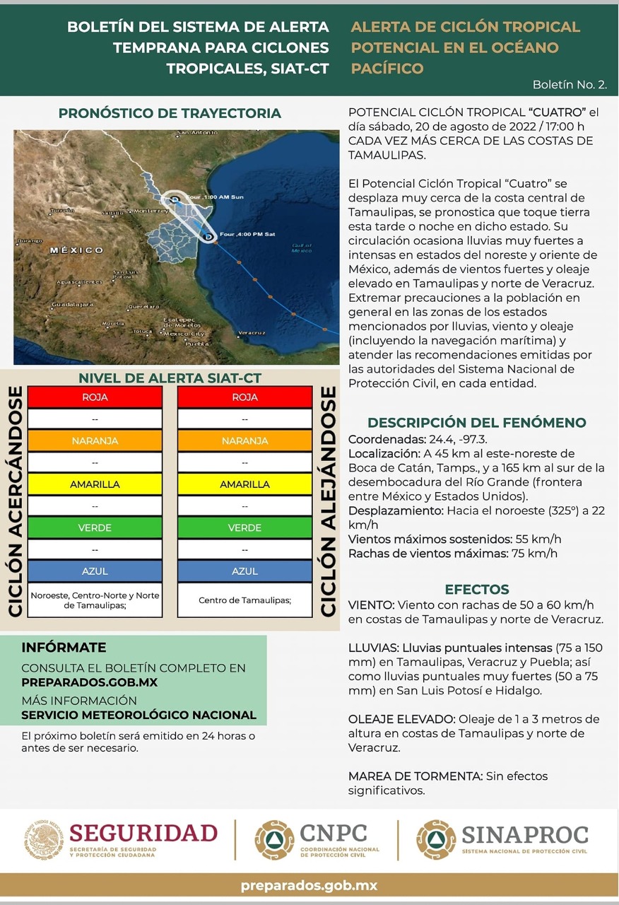 Ciudad Victoria, Tamaulipas. - El potencial Ciclón Tropical "Cuatro" tocó este día a las 7:00 pm la costa tamaulipeca a la altura de La Carbonera en la Laguna Madre, municipio de San Fernando, informó Protección Civil del Estado.