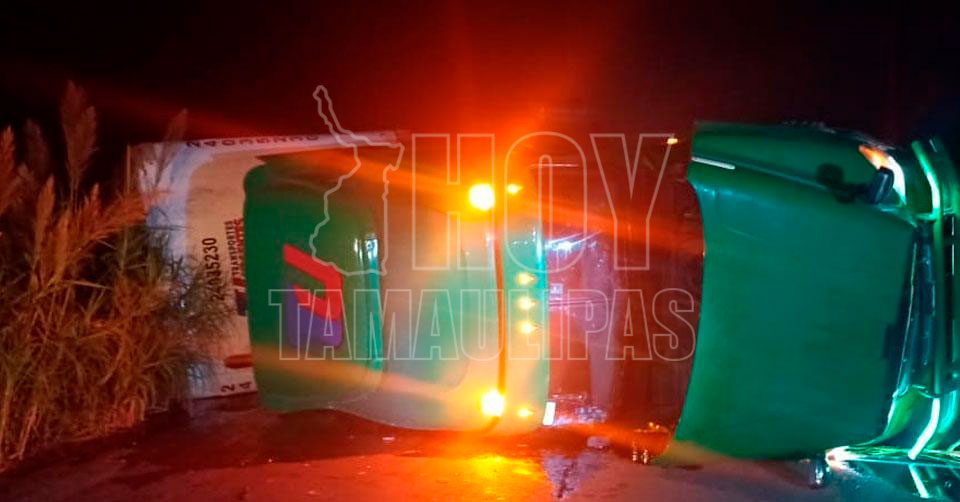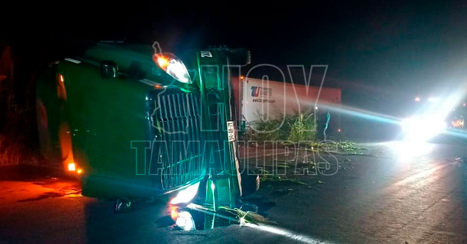 El Mante, Tamaulipas. - Un tractocamión doble articulado volcó esta madrugada en el Libramiento Poniente Américo Villarreal Guerra en El Mante, dejando como saldo cuantiosos daños materiales.