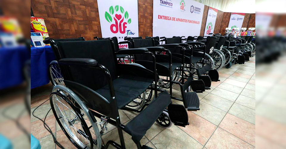 Tampico, Tamaulipas. - Apoyar a las familias vulnerables y facilitar el traslado de personas con algún tipo de discapacidad fomentando la inclusión, es misión del Sistema DIF Tampico, por ello, el presidente Municipal Chucho Nader y su esposa Aída Féres de Nader, presidenta del organismo encabezaron este martes la entrega de 59 aparatos funcionales y de movilidad asistida, mediante una inversión de 109 mil pesos.