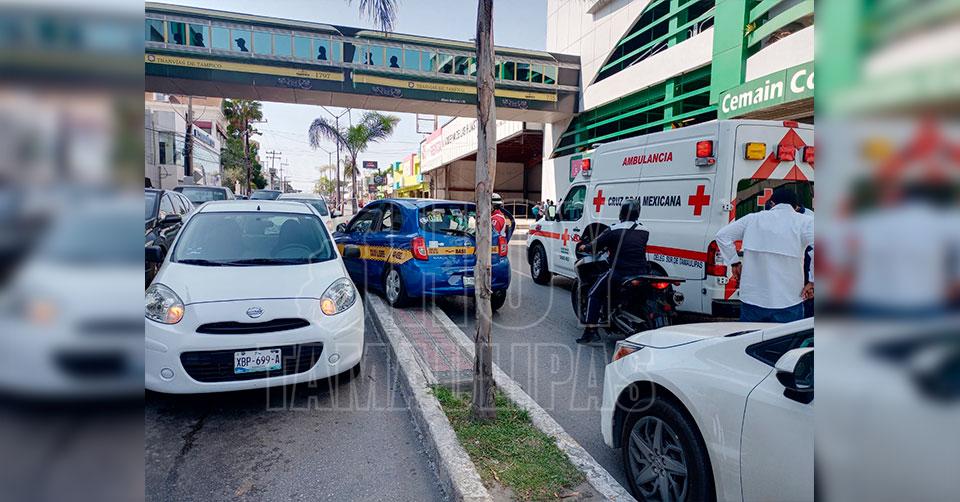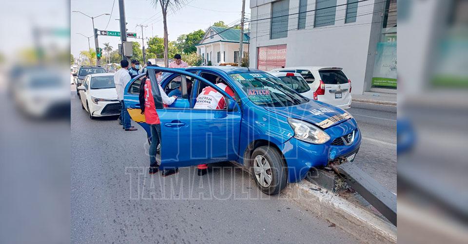 Taxista colisiona con dos vehículos y derriba poste de alumbrado público en Tampico