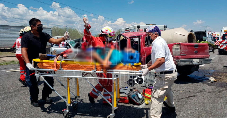 En la Ford Ranger viajaban dos personas adultas que se encuentran gravemente heridas; el chofer de la unidad quedó prensado y elementos de los cuerpos de rescate, entre ellos de Protección Civil de Villa de Casas tuvieron que quitar a pedazos los hierros retorcidos para sacarlo del vehículo.