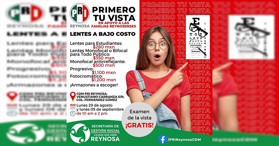 La dirigencia del PRI, lanzó a través de redes sociales una campaña oftalmológica denominada primero tu vista, dentro de la cuál ofrecerá lentes a bajo costo entre el día lunes 29 de agosto y el lunes 5 de septiembre.