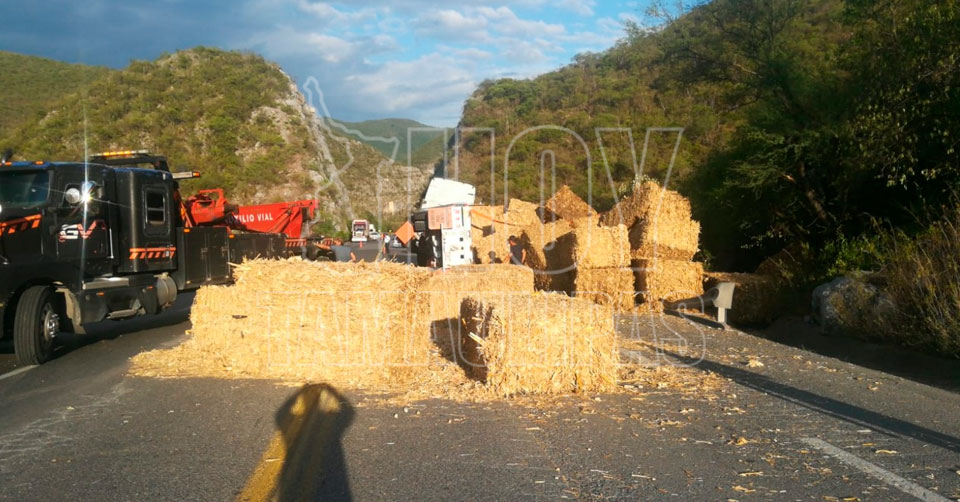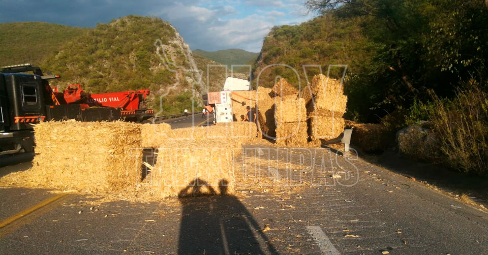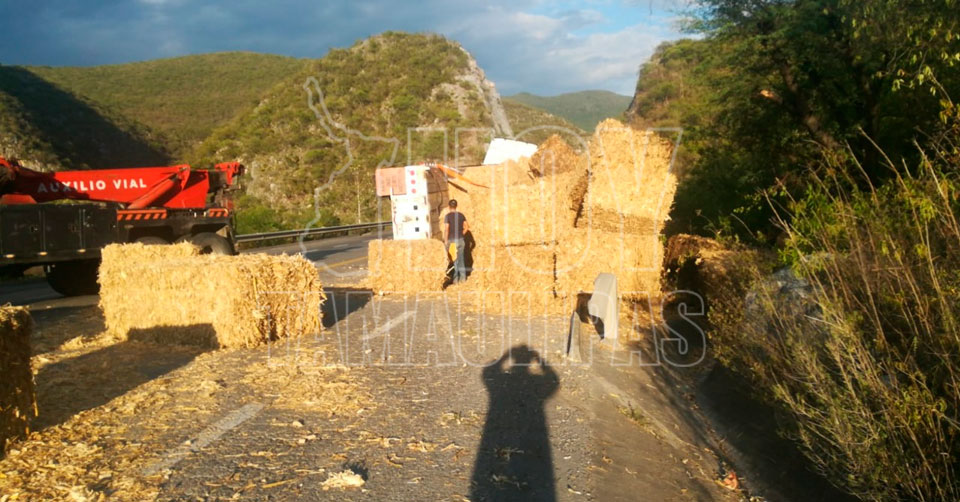 Ciudad Victoria, Tamaulipas. - El chofer de una tractocamión doble articulado y cargado con pacas de alimento, se llevó el susto de su vida, luego de fallarle los frenos y volcar un contenedor.