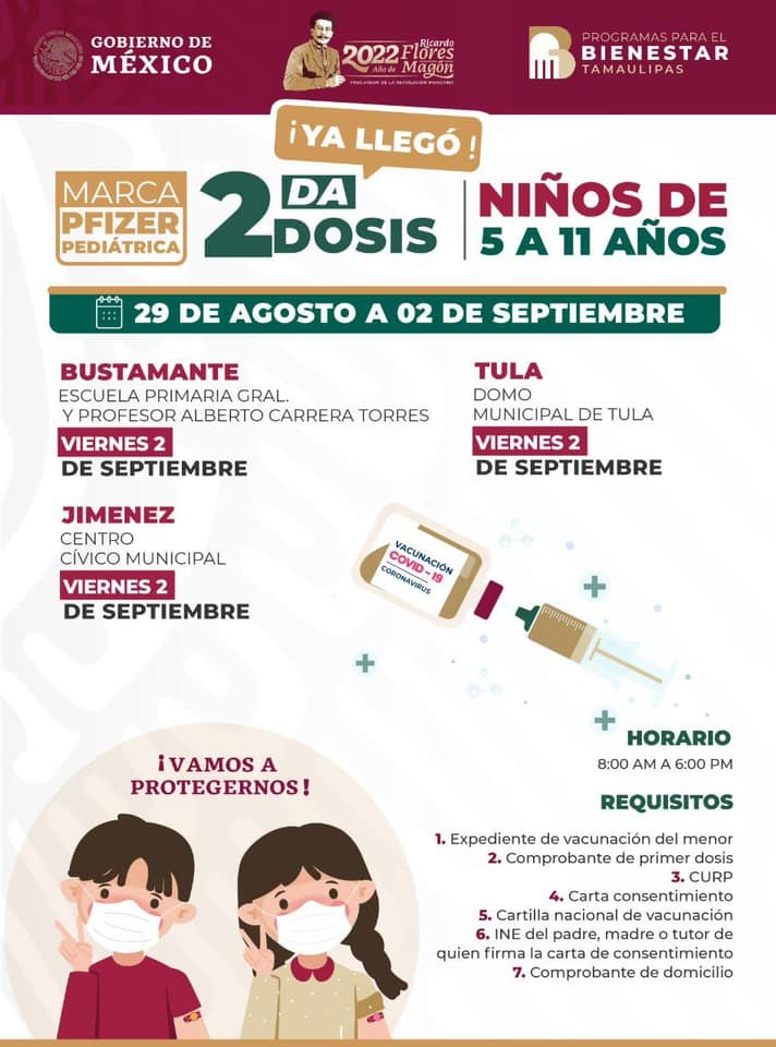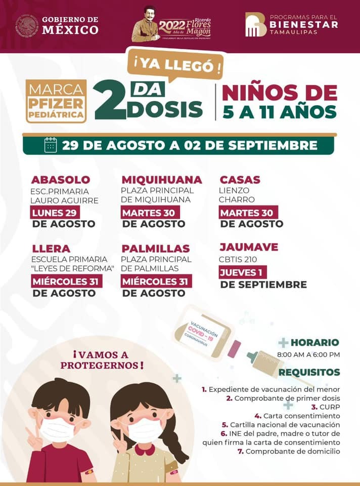 Ciudad Victoria, Tamaulipas. – La aplicación de la segunda dosis de la vacuna anti Covid para niños de 5 a 11 años arrancará en algunos municipios del centro y del altiplano de Tamaulipas a partir del lunes 29 de agosto y hasta el 2 de septiembre con el biológico de Pfizer.