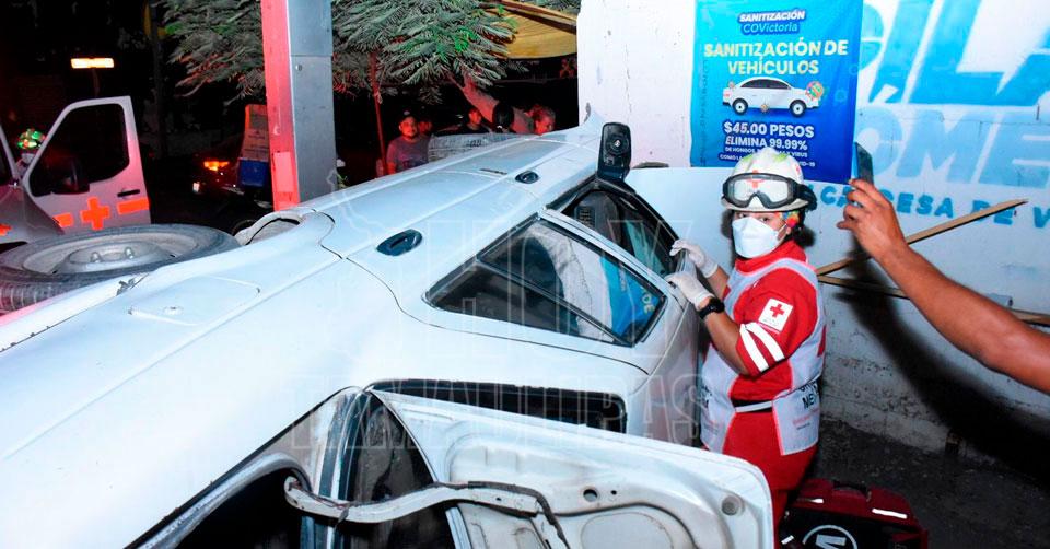 Tras la volcadura, el hombre de 73 años de edad quedó atrapado al interior de su Nissan Tsuru blanco, por lo que fue necesaria la intervención de un equipo de rescate de la Cruz Roja.