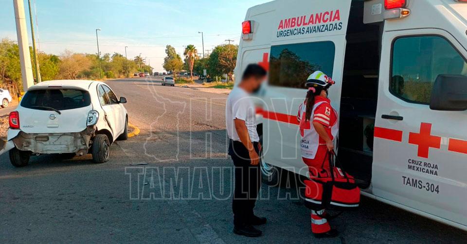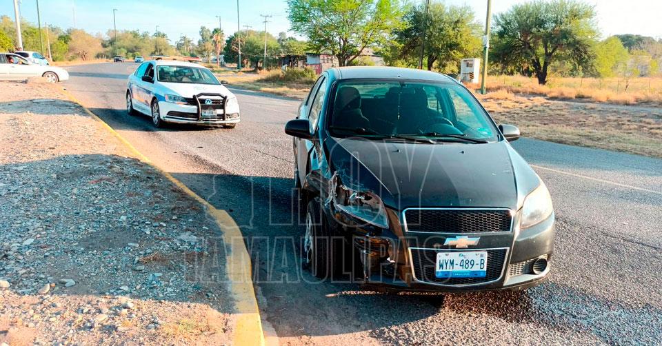 Ciudad Victoria, Tamaulipas. - Un elemento de Tránsito y Vialidad resultó lesionado esta mañana luego de que la unidad Uber en la que viajaba fue impactada por otro automóvil en la carretera Victoria-Llera de Canales y Avenida América Española en la capital.