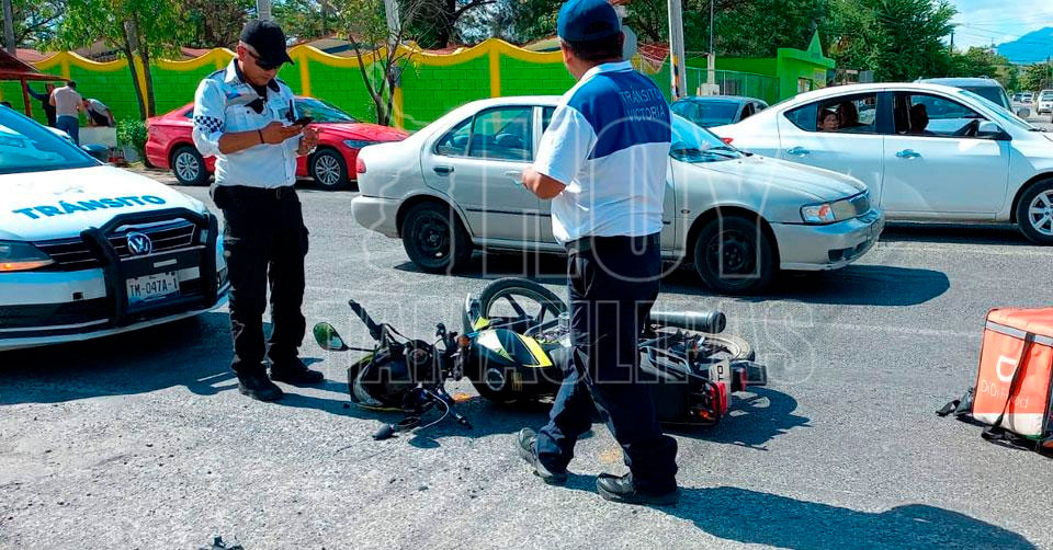 Ciudad Victoria, Tamaulipas. – Un motociclista repartidor de comida rápida resultó lesionado esta mañana, luego de impactarse contra un automóvil que se atravesó a su paso en el tres Berriozábal en Ciudad Victoria.