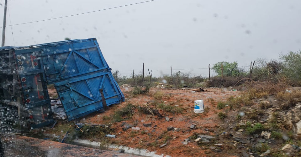 Jaumave, Tamaulipas. – Un tractocamión articulado con un contenedor que trasportaba sorgo terminó volcado esta mañana en la carretera federal 101, tramo Jaumave-Palmillas.