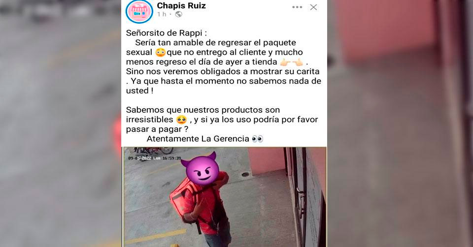 Matamoros, Tamaulipas. - El negocio de “Chapis” Ruíz en Matamoros denunció, a través de su cuenta de Facebook, a un repartidor de Rappi que no entregó un paquete sexual.