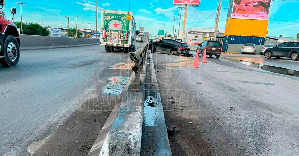 Matamoros, Tamaulipas. - Una embarazada que venía discutiendo con su esposo perdió el control de su camioneta de modelo reciente y la estrelló contra el muro del puente vehicular en Matamoros, por lo que tras el encontronazo la unidad quedó dañada.