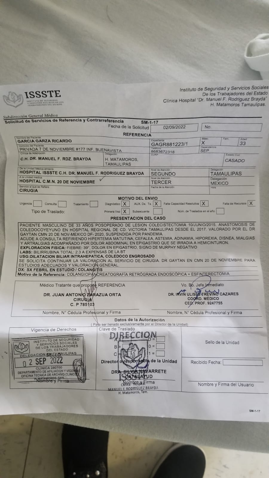 Matamoros, Tamaulipas. - Aún y cuando la vida de un paciente corre peligro, los directivos del ISSSTE de Matamoros no han querido autorizar el traslado a la ciudad de México para una pronta operación que requiere, esto a raíz de una mala operación que le realizaron en dicho nosocomio de la vesícula, y que terminaron perforándole los intestinos; en estos momentos le está generando una pancreatitis.