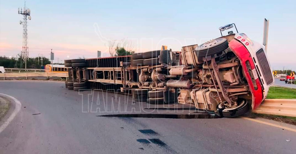 La volcadura se registró cuando la pesada unidad circulaba de poniente a oriente por la carretera Río Bravo-Reynosa y al intentar tomar la salida al libramiento terminó volcando hacía su lado izquierdo debido al exceso de velocidad.