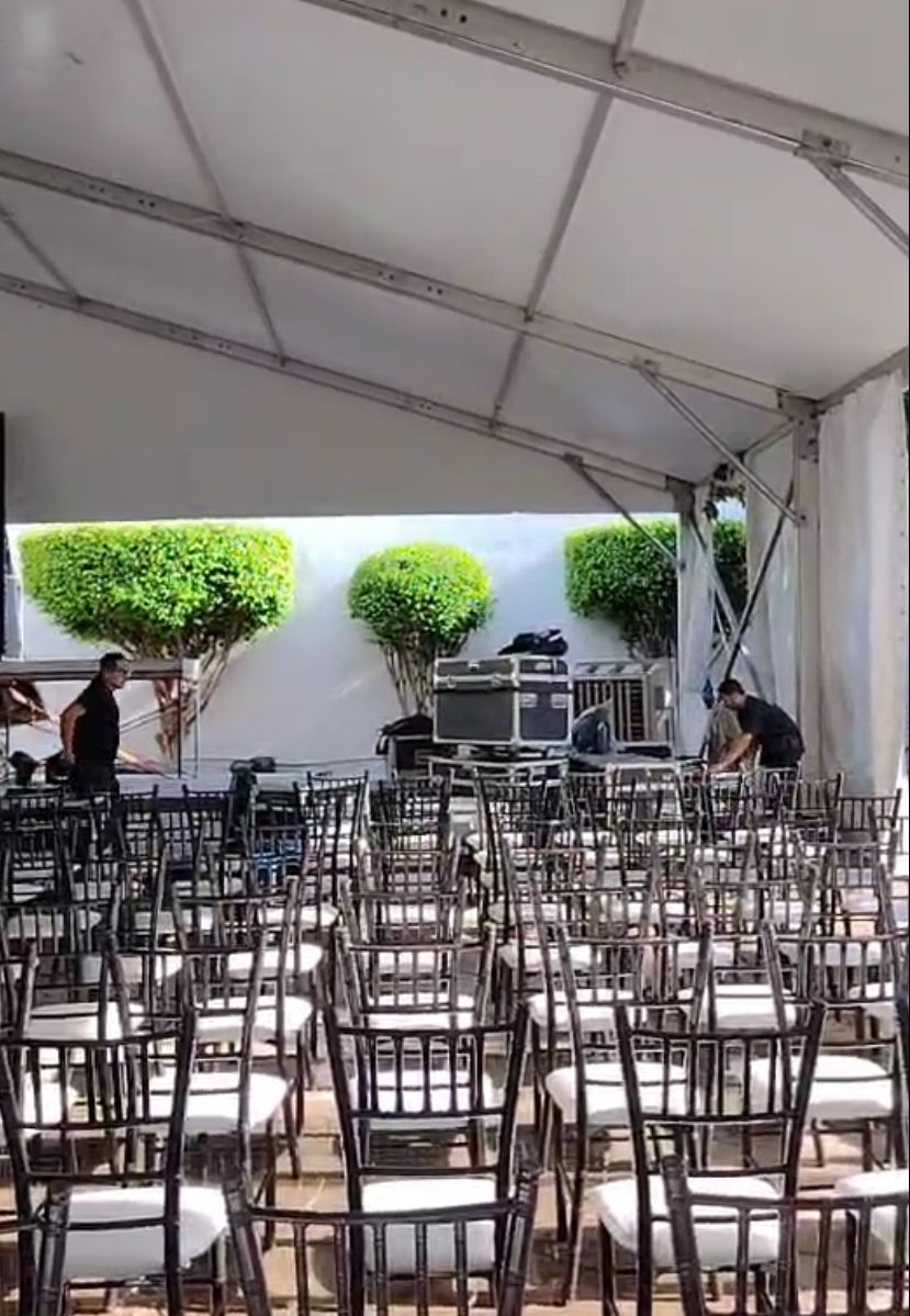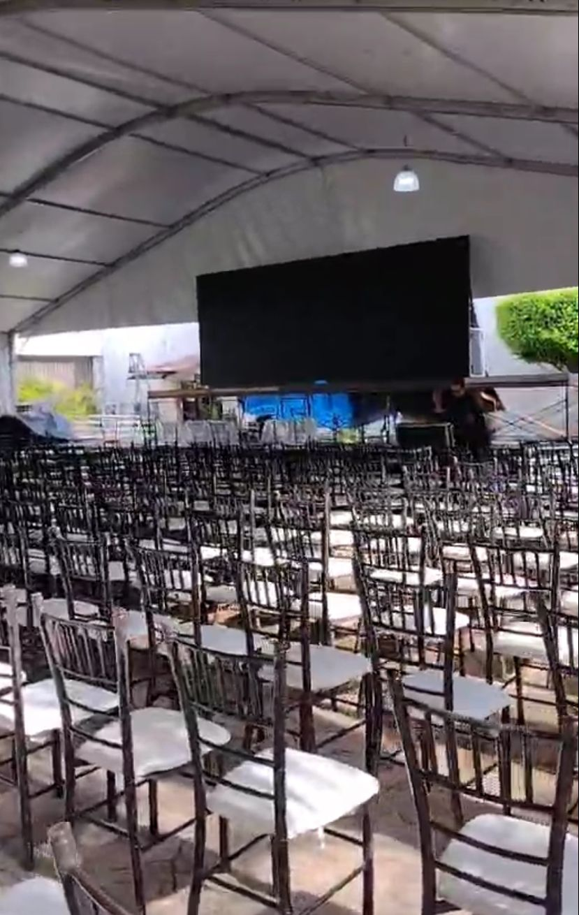 En la explanada del Ayuntamiento ya fueron colocadas varias filas de sillas y el escenario.