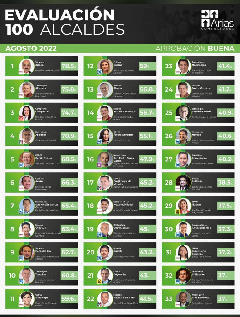 Con base a los resultados de la última encuesta nacional correspondiente al mes de agosto de 2022, sobre las condiciones de gobierno en México, realizada en las 32 entidades, elaborada por la casa encuestadora Arias Consultores, el alcalde altamirense registra el 75.8 por ciento de aprobación a su trabajo, posicionándose con ello, en el segundo sitio a nivel nacional (100 alcaldes evaluados) y el primero en el Estado de Tamaulipas.
