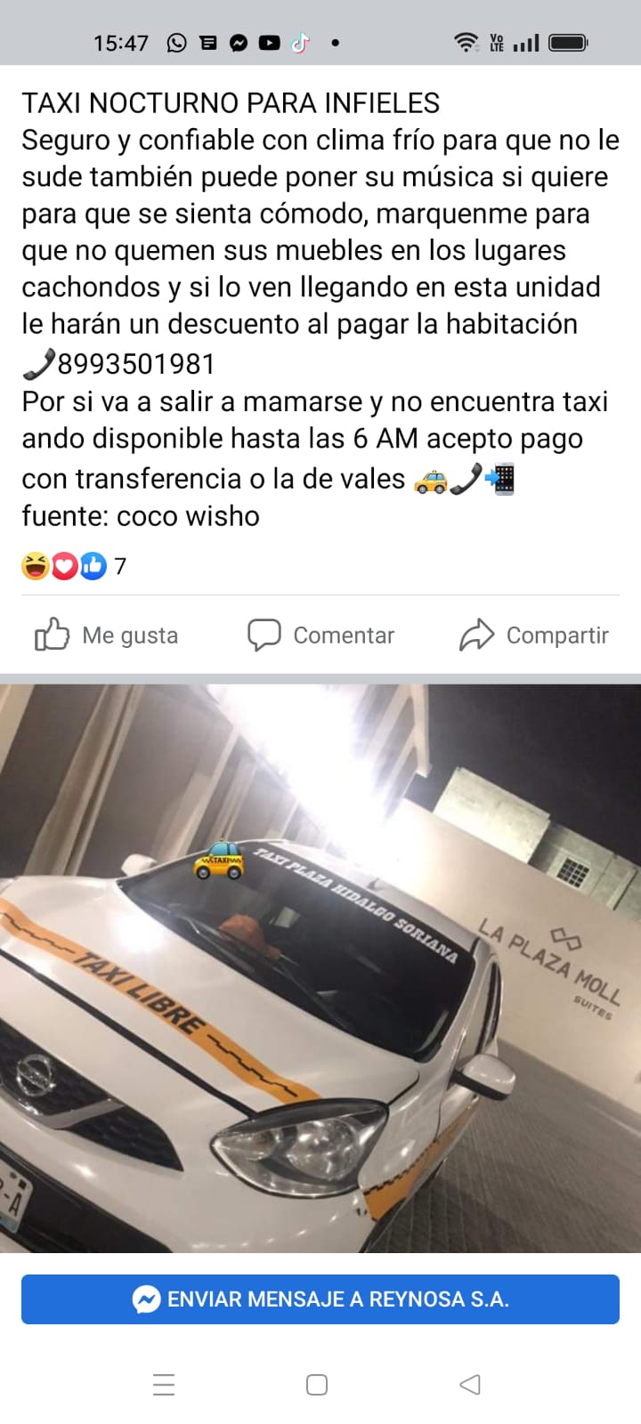 Reynosa, Tamaulipas.- El anuncio de un taxista que realiza servicios de taxi nocturno circula en redes sociales, pero se anuncia cómo "taxi nocturno para infieles".