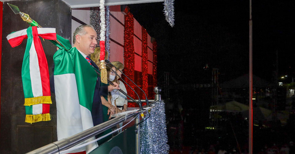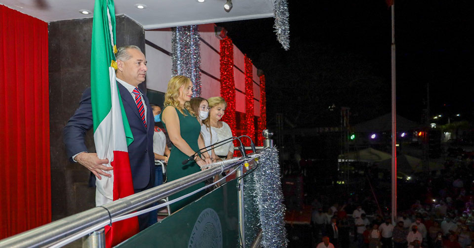 Ciudad Madero, Tamaulipas. - En Ciudad Madero, un municipio de grandeza y donde se avanza con esperanza, el alcalde Adrián Oseguera Kernion salió al balcón presidencial la noche de este 15 de septiembre para dar el grito que honra a quienes dieron su vida por la Independencia de México y ondear con firmeza la Bandera Nacional en presencia de miles de maderenses.