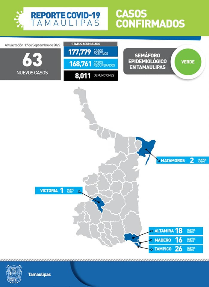 Ciudad Victoria, Tamaulipas. - Un total de 63 nuevos contagios de Covid-19, sin ninguna muerte por complicaciones graves de la enfermedad se reportaron este sábado en Tamaulipas, informó la Secretaría de Salud del Estado.