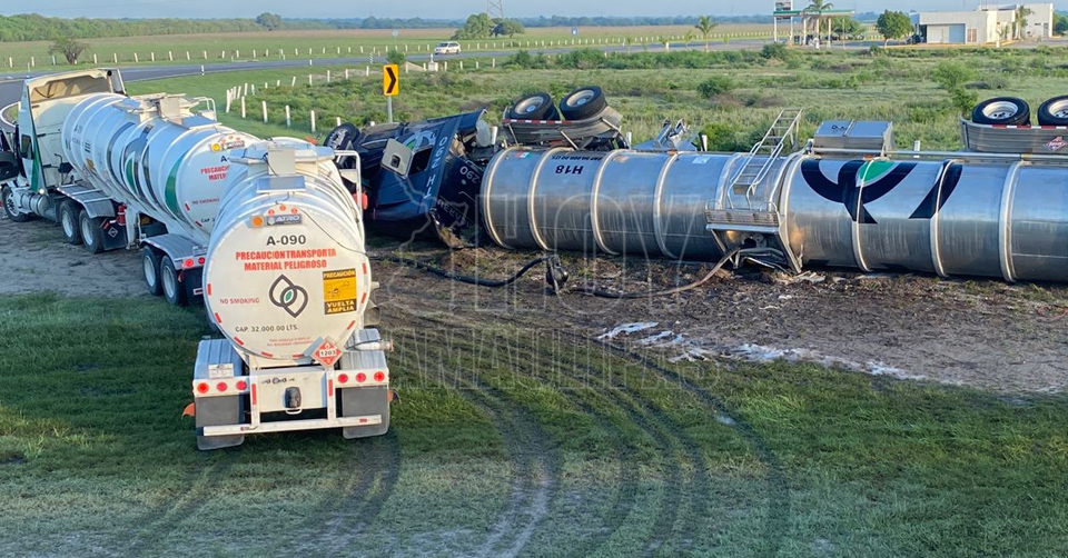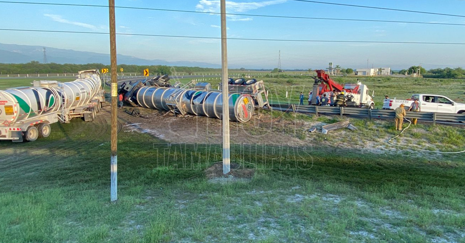 Ciudad Victoria, Tamaulipas. - Una pipa que transportaba más de 30 mil litros de gasolina volcó esta madrugada a la altura del kilómetro 15 de la carretera Victoria-Matamoros.