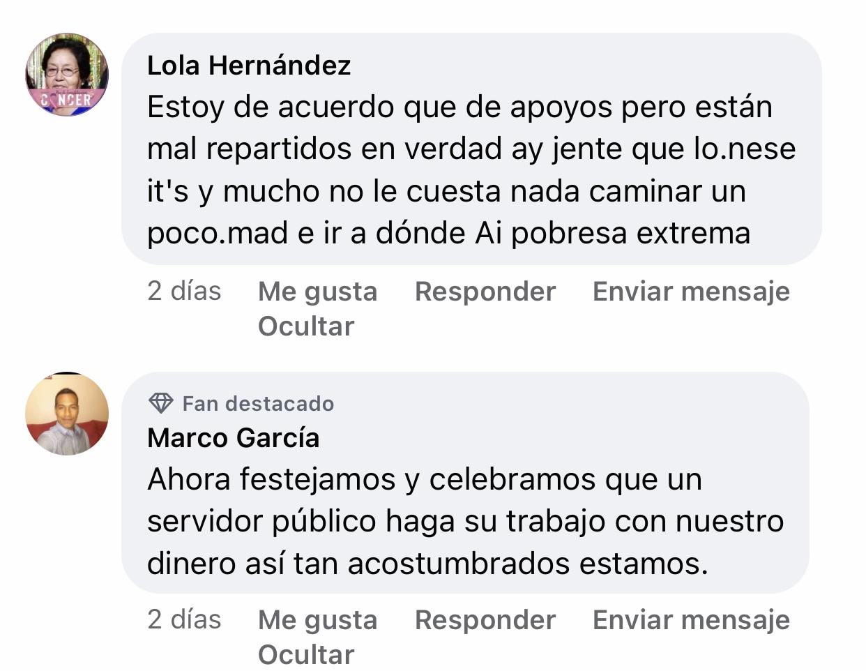 Mientras tanto, en otros comentarios que son los que más se publican, es que solo está beneficiando a los amigos de sus familiares o a personas que no requieren de su apoyo, tomando en cuenta que en la ciudad existen familias en pobreza extrema y no reciben apoyo alguno por parte del legislador.