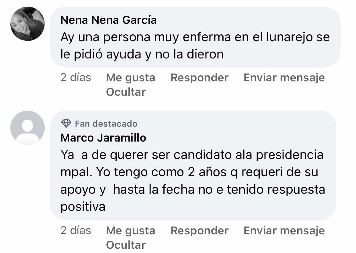 Nena García, una de las personas que comentó en las publicaciones del diputado, argumenta que “hay una persona muy enferma en el Pumarejo se le pidió ayuda y no le dieron”.