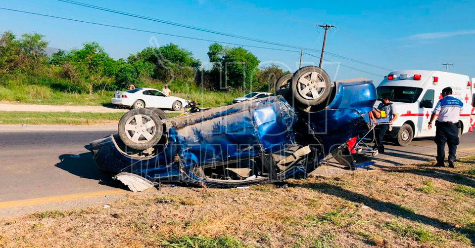 Ciudad Victoria, Tamaulipas. – Tres estudiantes de la Universidad Politécnica resultaron lesionados esta mañana, luego de que el carro en el que viajaban se impactó contra una luminaria y luego volcó en el Libramiento Naciones Unidas entrada al Fraccionamiento Marte R. Gómez.
