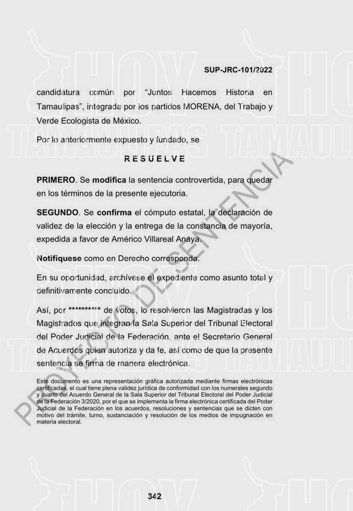 Segundo, se confirma el cómputo estatal, la declaración de validez de la elección y la entrega de la constancia de mayoría, expedida a favor de Américo Villarreal Anaya.