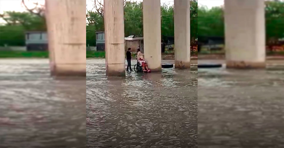 Las personas de la tercera edad, una de ellas en silla de ruedas, se habían quedado atrapadas por la fuerte corriente de agua debajo del Puente Broncos, en donde la acumulación de agua puede llegar en ocasiones hasta un metro de alto.