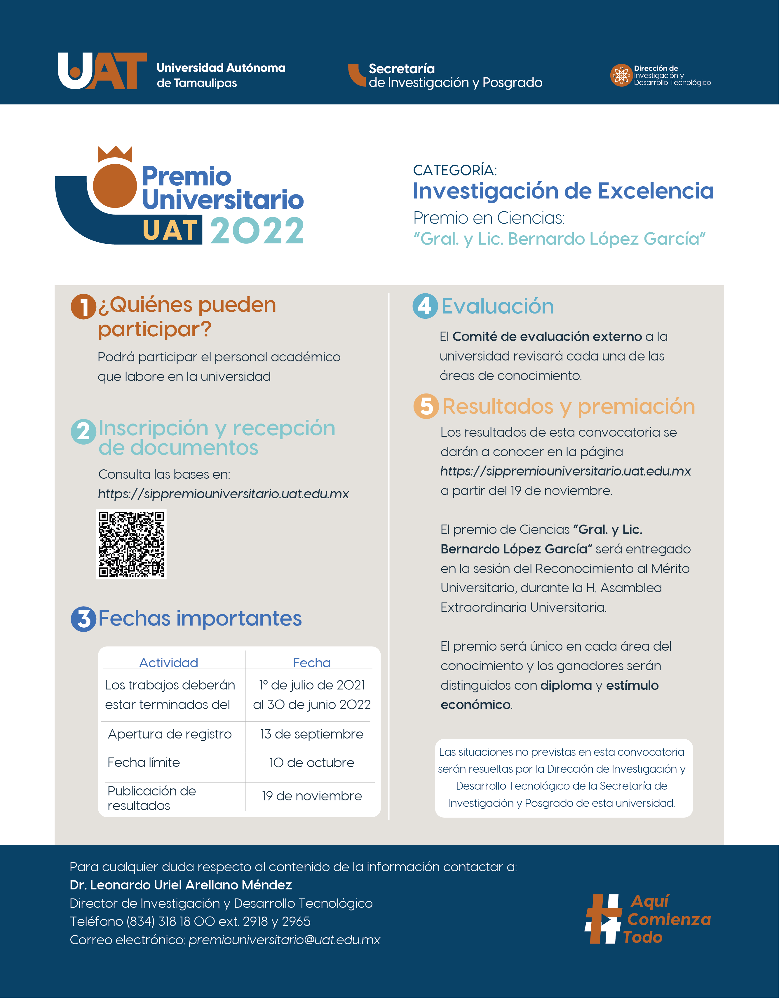 Para mayores informes, llamar al teléfono 834 318 1800, extensiones 2918, 2959 y 2965, o escribir al correo electrónico premiouniversitario@uat.edu.mx de la Dirección de Investigación y Desarrollo Tecnológico de la UAT.