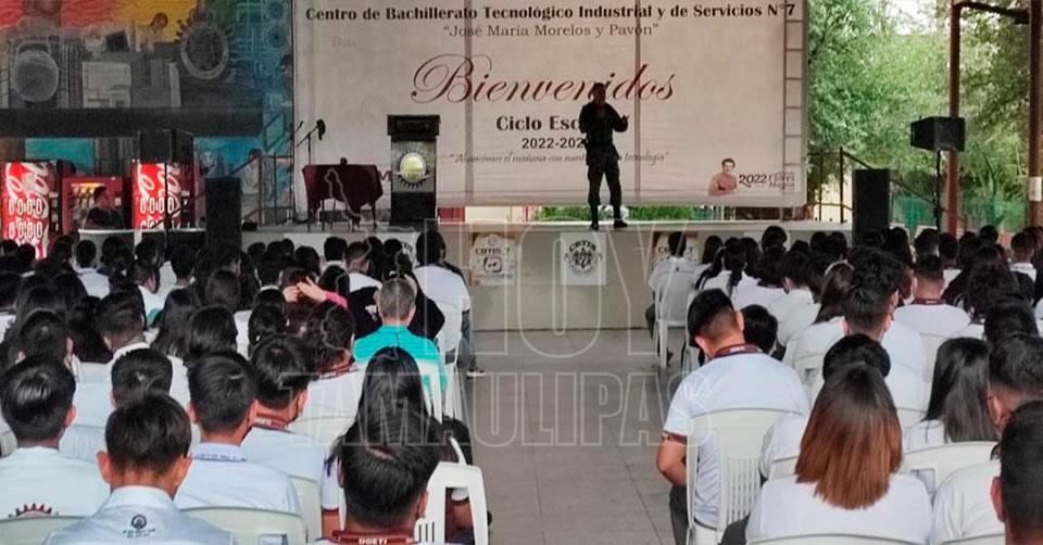 Reynosa, Tamaulipas. - Alumnos del Centro de Bachillerato Tecnológico y de Servicios número 7 recibieron una plática por parte de elementos del Ejército Mexicano, relacionada con diversos temas.