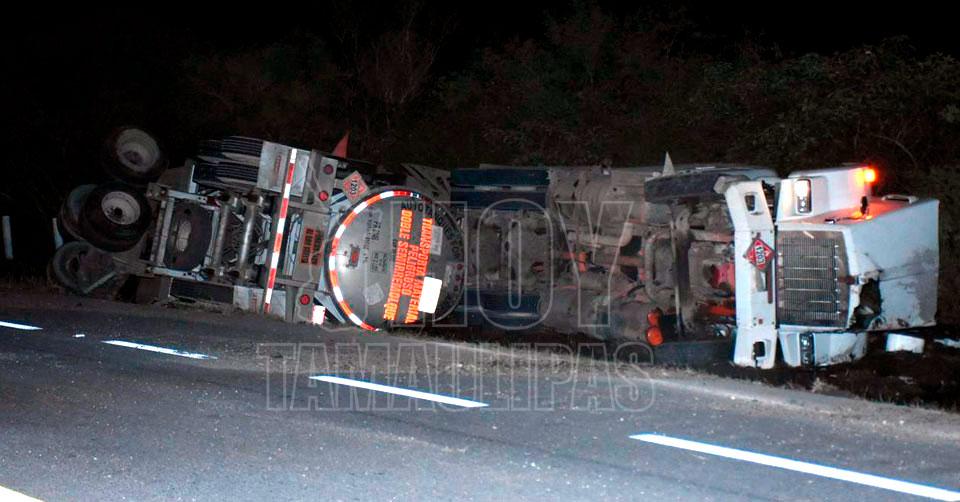 Ciudad Victoria, Tamaulipas. - La carretera Zaragoza-Victoria, a la altura del kilómetro 70, permanece bloqueada a la circulación vial tras la volcadura de una pipa que transportaba gasolina.