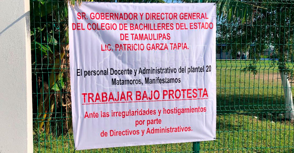 Matamoros, Tamaulipas. - Personal docente y administrativo del Colegio de Bachilleres de Tamaulipas (Cobat) número 20 en Matamoros, se manifestaron a través de una manta en donde expresan que estarán trabajando bajo protesta debido a la denuncia que hacen de ser víctimas de irregularidades y hostigamientos por parte de directivos y administrativos.