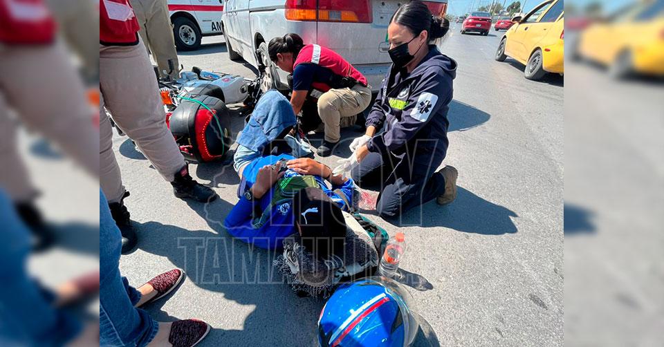 Matamoros, Tamaulipas. - Con posibles fracturas resultó un motociclista que se impactó contra una camioneta que se le atravesó en la avenida Lauro Villar.