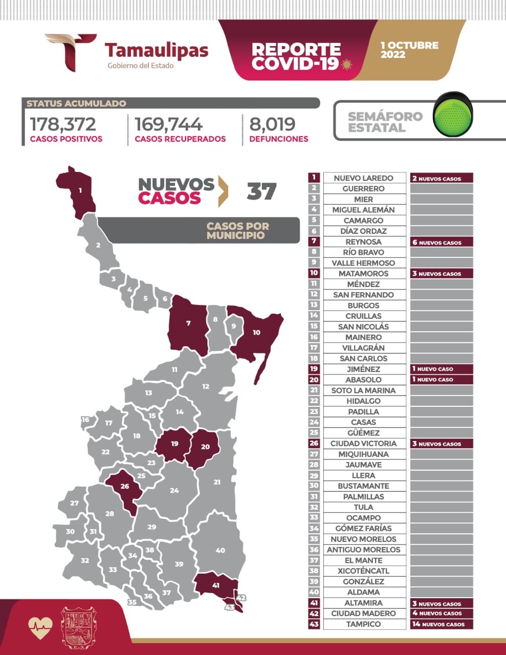 Cierra este sábado Tamaulipas con 37 nuevos contagios de Covid-19