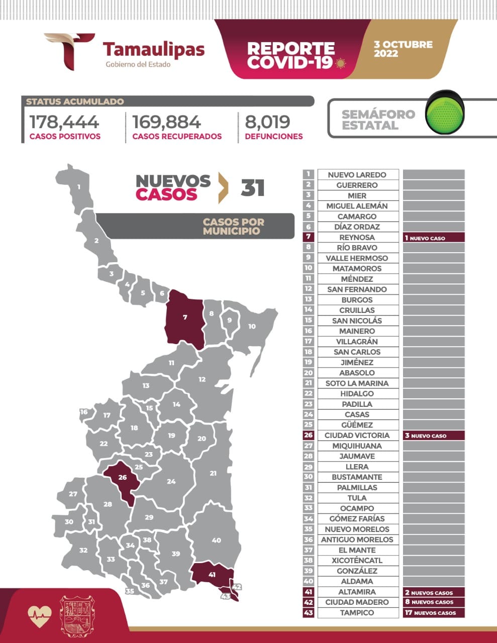 Ciudad Victoria, Tamaulipas. – Un total de 31 nuevos contagios de Covid-19 se reportaron este lunes en Tamaulipas, sin ninguna muerte por complicaciones graves de la enfermedad, informó la Secretaría de Salud del Estado.