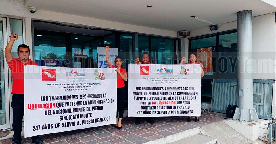 Ciudad Madero, Tamaulipas. - Un grupo de trabajadores sindicalizados del Nacional Monte de Piedad, protestaron afuera de la sucursal de la zona centro de Ciudad Madero, para oponerse a la liquidación del contrato colectivo de trabajo.